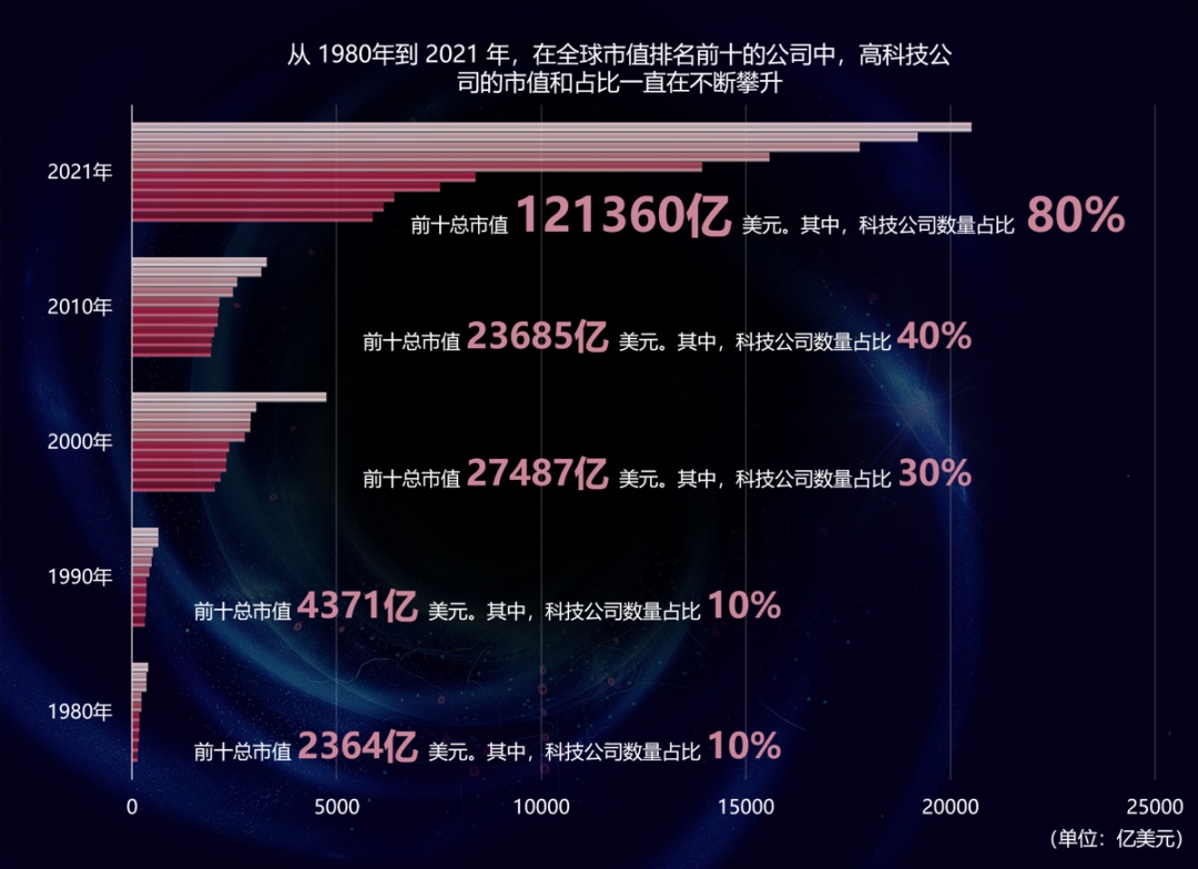 1980年,全球前十大上市公司的总市值约为2364亿美元,十家中只有一家是数字相关的公司IBM。2021年全球前十大上市公司的总市值是121360亿美元,其中八家和数字技术相关。这个数字变化说明从供给侧的角度看,数字经济已经占越来越大的比重。另外,2010年前十大上市公司的总市值是23685亿美元,2021年已经有两大上市公司的市值超过了2.5万亿美元,一个是微软,一个是苹果,一家上市公司已经相当于十年前全球十大上市公司市值,这样的增长速度和规模在人类历史上是空前的。