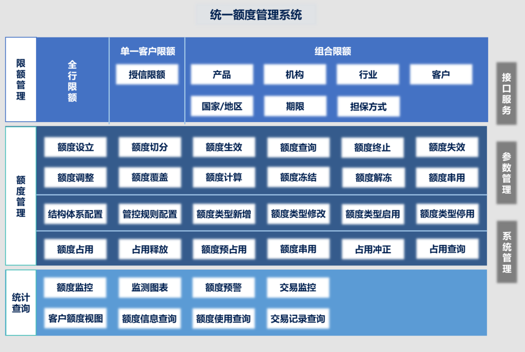 构建全行涉及额度所有业务的集中管理体系,提供统一的额度处理服务、统一的风险管控策略、标准的信息交互规范,提供全行信贷资产业务的额度全视图。