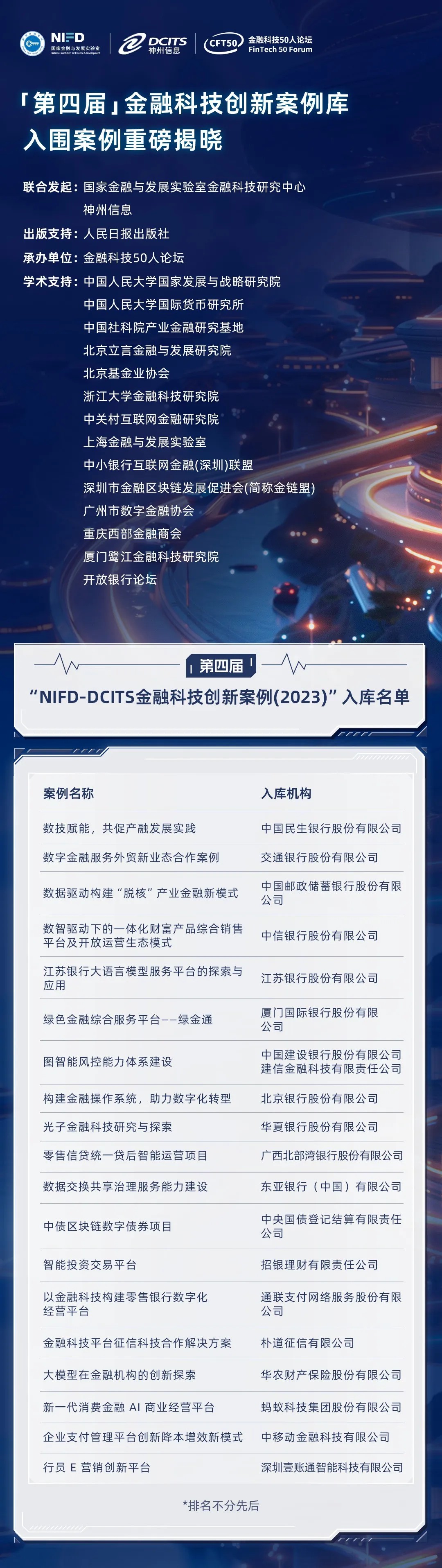 本届入库的19个案例,收录于《数字金融+新质生产力:金融科技创新实践》一书中,已由人民日报出版社发行。我们真诚地向为本书顺利出版提供过指导与帮助的专家和机构致谢,未来期待更多的金融科技生态伙伴参与到案例编写工作中。“NIFD-DCITS全球金融科技创新案例库”旨在建设成为国内外顶尖的金融科技创新案例聚合基地,不仅为政府、监管、金融机构和企业提供重要参考素材,还将为国内外院校的教学、研究提供鲜活资料,有效服务于我国金融科技的健康发展,并且向国际社会充分展示我国优秀金融科技企业的风貌。